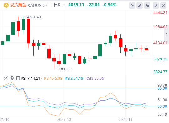在日线图上,黄金交易于4065.29美元。50日、100日和200日简单移动平均线(SMA)上升,而价格保持在其上方,维持看涨偏向。21日SMA已趋平并略微下滑,4044.66美元提供了附近的动态支撑。相对强弱指数(RSI)为52.00(中性),反映出近期反弹后的动能平衡。