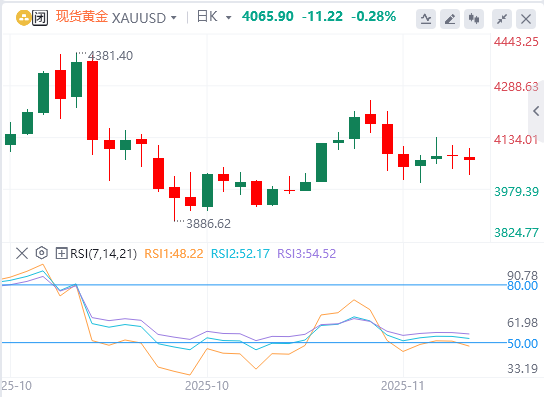 下行方面,8月至10月上升趋势的斐波那契38.2%回撤位与50日SMA共同构成3980-3970美元的初步支撑区域,随后是3900美元(整数关口)和3845美元(斐波那契50%回撤位)。上行方面,阻力位可能出现在4130美元(斐波那契23.6%回撤位、下降趋势线)、4245美元(11月13日高点)和4300美元(整数关口)。