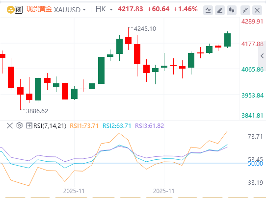 下行方面,4,125美元构成首个支撑位,随后依次是4,085美元(20日SMA)、4,030美元(50日SMA)和3,970美元(38.2%斐波那契回撤位)。上行方面,阻力位可能出现在4,245美元(11月13日高点)、4,300美元(整数关口)和4,380美元(上涨趋势终点)处。