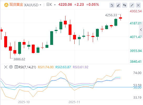 在日线图上,21日、50日、100日和200日简单移动平均线(SMA)均呈现出看涨排列,价格位于其上方,而21日SMA在4095.07美元附近提供了动态支撑。相对强弱指数(RSI)为65.97,反映出强劲的上涨动能,尚未进入超买区域。从4381.17美元的高点到3885.84美元的低点测量,78.6%的回撤位在4275.16美元,限制了近期的上涨。若能果断收于其上方,可能会延续上涨。