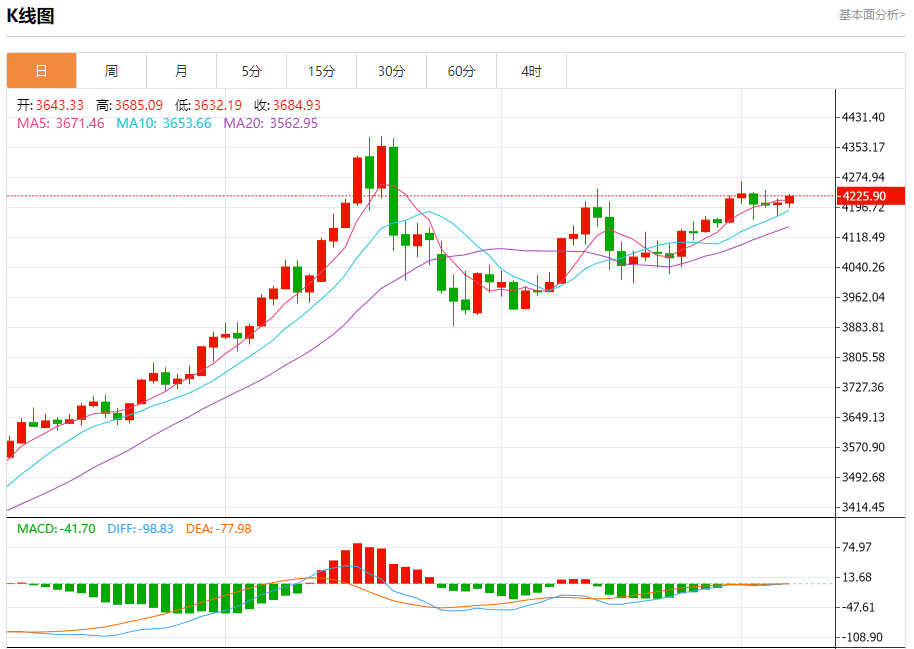 周五盘中,现货黄金报4225.76,涨幅0.41%。