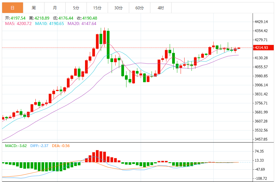 日线级别:金价仍运行于4163-4265美元的宽幅震荡区间内,昨日收出带长下影的十字星,反映下方支撑韧性与上方压制并存。5日与10日均线高度黏合于4208美元附近,MACD指标在零轴上方走平,红绿色柱交替且幅度微弱,表明短期市场缺乏明确趋势方向。不过从均线系统看,MA50、MA100等中长期均线呈多头排列,且金价始终运行于均线上方,中长期上涨结构未被破坏。