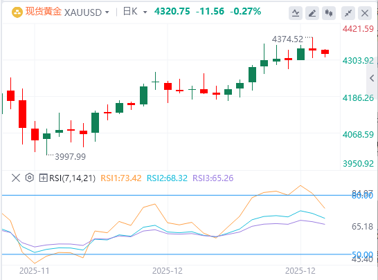 黄金的第一个上行障碍出现在布林带4352美元上界。若能果断突破该水平,可能表明买家准备进攻,继续攀升至历史高点4381美元,最终冲击4400美元心理关口。