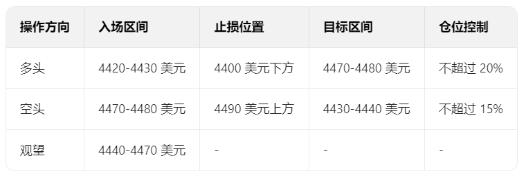 逻辑支撑:机构低吸区域,市场普遍预期在4420-4440美元区间分批布局多单,不超过总仓位20%