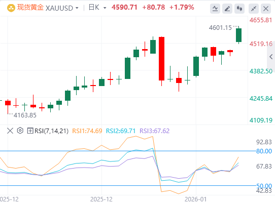 同时,欧洲盟国也在调整战略部署。英国和德国正在讨论增强在格陵兰岛的军事存在,旨在向美国政府展示北约对北极安全事务的重视。这一系列地缘政治动荡显着提升了市场避险情绪,推动传统避险资产黄金买盘激增。