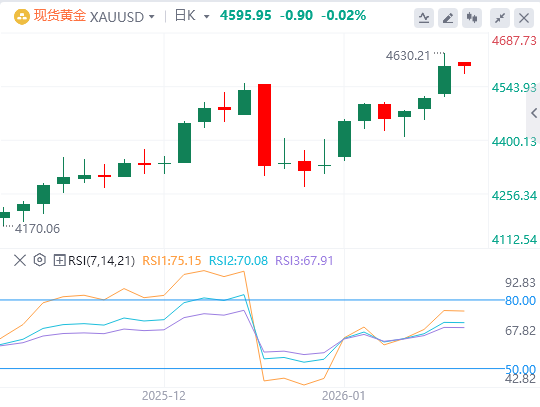 从3,920.24美元起的上升通道引导上升趋势,阻力位在4,656.02美元附近。50日简单移动平均线(SMA)走高,凸显了企业买入偏向。XAU/USD货币对稳守移动平均线上方,保持多头控制。移动平均收敛背离线(MACD)位于信号线之上,两者均处于正值区间。扩大的正直方图显示动能增强,相对强弱指数(RSI)报70.26(超买),可能将涨幅限制在通道天花板内。