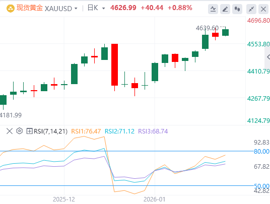 九天指数移动平均线(EMA)高于50日移动平均线,确认了明显的多头偏向。黄金价格保持在较快的平均线之上,50天斜率持续推进,凸显了中期的上行空间压力。14天相对强弱指数(RSI)位于71.39,显示超买,显示出动能被拉长,尽管趋势保持不变。