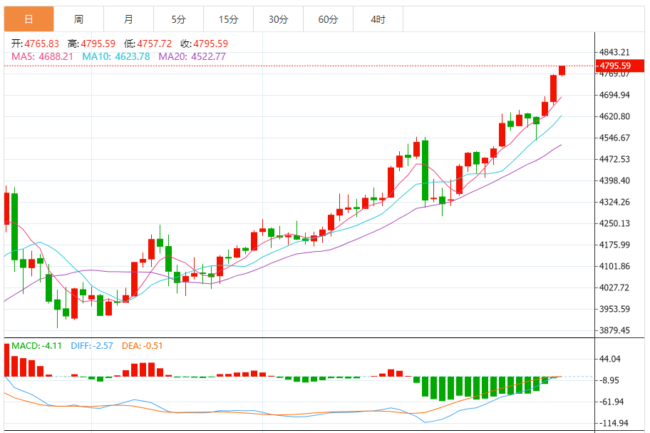 日线级别:呈现强劲多头格局,价格突破4700美元历史阻力后延续上行,均线系统维持5/10/20日均线多头排列,5日均线支撑位于4675-4680美元区间,为短期趋势提供依托。K线收出带长上影线的阳线,显示高位抛压增强,且价格触及4760-4785美元强阻力区(前期高点+60日均线+斐波那契61.8%回撤位共振),首次突破后难以快速站稳,震荡消化获利盘概率较大。