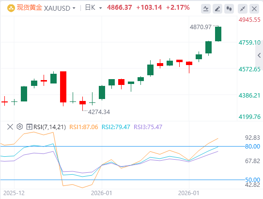 最新的上涨确认了本月迄今上升通道顶部的新一轮多头突破。随后突破4800美元大关的强势支持了建设性前景,支持了这一稳固上升趋势的延续。移动平均线收敛背离线(MACD)延伸至信号线之上,两者均高于零,反映多头动能增强;正直方图变宽,强化了积极的音调。
