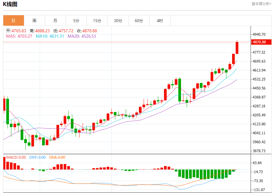 周三盘中,现货黄金报4864.54,涨幅2.12%。