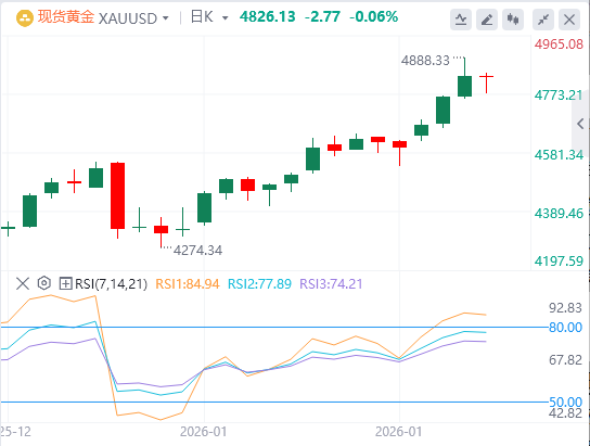 从4535.22美元最低点测得4889.37美元高点,38.2%的斐波那契回撤4754.08美元提供初步支撑,而23.6%的斐波干指数。水平为4805.79,坐垫下沉;保持这些支撑位上方将保持恢复路径的完整。短期内,价格持续接受在上升的100小时均线上方,将保持阻力最小的向上路径。如果MACD突破信号线且RSI回升50,动能将增强;而未能守住平均线则将使市场面临更深回调并延长盘整。