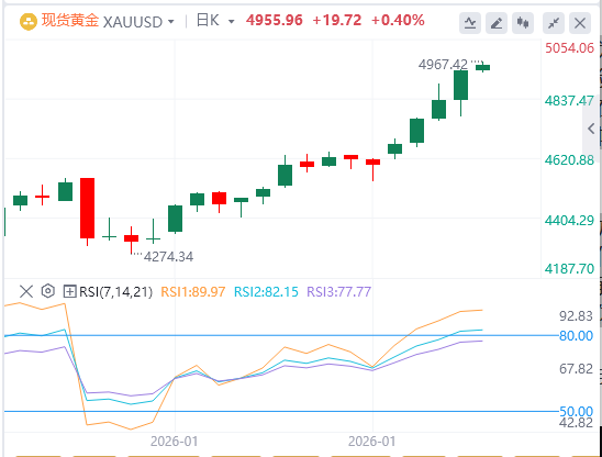 本周突破自十月底起的上升通道顶部,被视为黄金多头的关键触发点,验证了近期的积极前景。移动平均收敛背离线(MACD)位于信号线之上,两者均位于零上,正直方图也在扩大,表明多头动能增强。RSI在81.11被超买,短期内可能限制涨幅,尽管突破有利于上涨空间的持续。