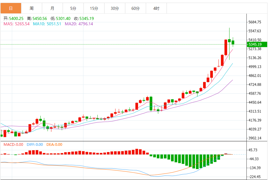 日线图显示,黄金自2025年8月下旬以来形成标准上升通道,均线系统呈完美多头排列,5日均线(约5400美元)与10日均线(约5280美元)构成关键支撑带。今日价格虽大幅回落,但尚未跌破上升通道下轨,长期上涨结构保持完整。