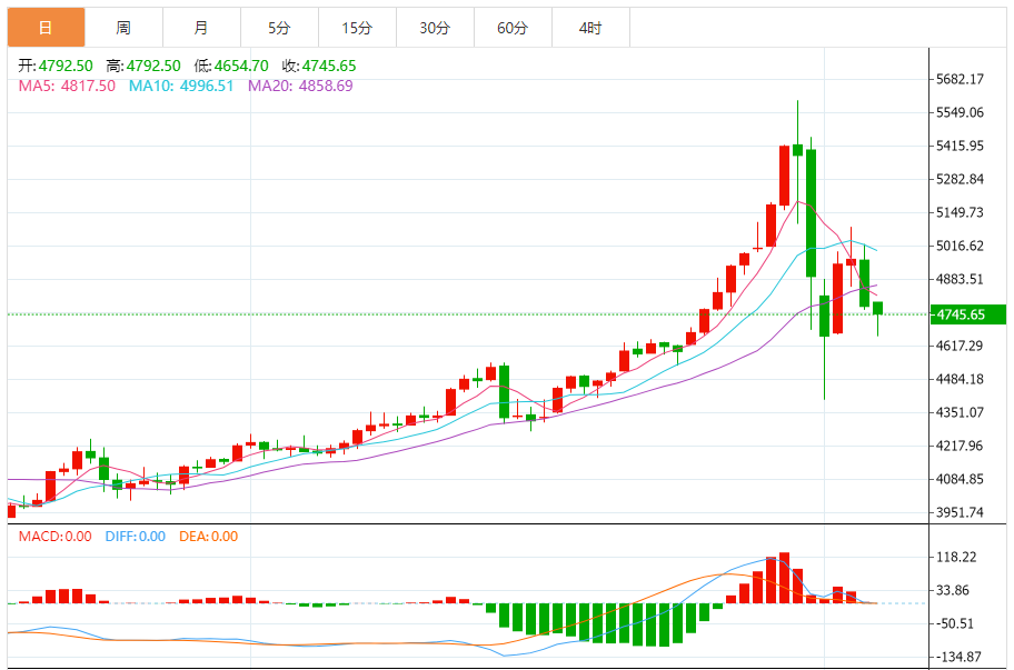 1小时图显示价格跌破前期上升通道下轨后,在4650-4700美元区间形成“双底”形态,颈线位4750美元微博。KDJ指标低位金叉,暗示短期反弹空间,但上方4800美元压力明显,反弹高度或受限。操作上,4700-4720区间可轻仓试多,止损4680,目标4780-4800微博。