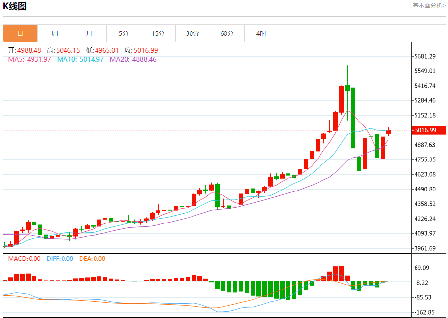 昨天黄金在反弹至1272附近后,遇阻回落,并刷新近期低点至1250附近,目前在1257附近弱势震荡。日线级别,布林带三轨平行向下,下跌趋势明显。5日均线和10均线同样顺势向下。MACD空头能量继续发散,表明市场整体上仍处于空头势力占优的环境中。