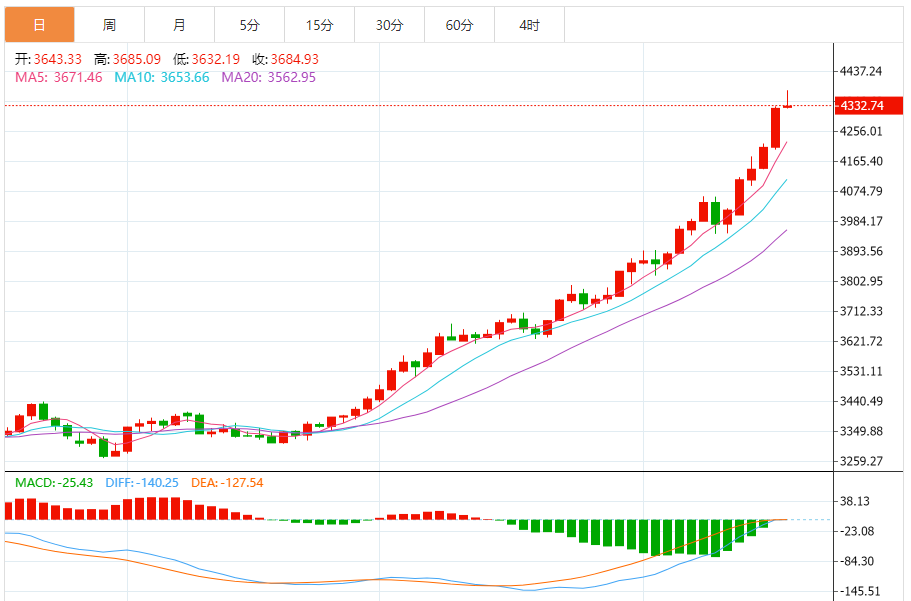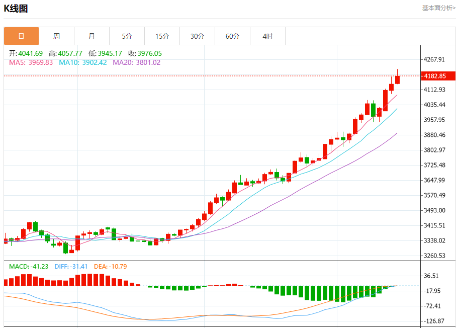 截至2025年10月16日19时25分,国际黄金期货(纽约金)价格为4260.2美元/盎司,较前一交易日上涨58.6美元,涨幅1.39%,最高达到4262.5美元/盎司,最低为4214.5美元/盎司。国际黄金现货(伦敦金现)价格为4244.91美元/盎司,上涨35.72美元,涨幅0.85%,最高4245.82美元/盎司,最低4203.28美元/盎司。 从技术分析来