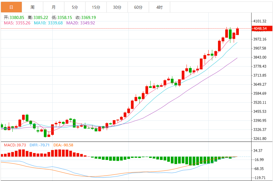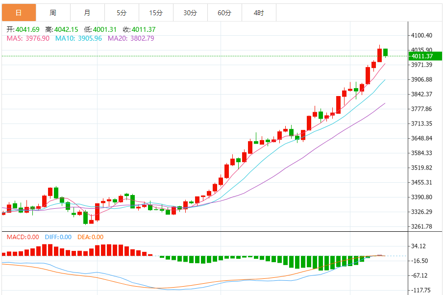 行情回顾 截至10月9日19时11分,国际黄金期货(纽约金)价格为4054.5美元/盎司,较前一交易日下跌16美元,跌幅0.39%,最高达到4064.6美元/盎司,最低为4019.2美元/盎司。国际黄金现货(伦敦金现)价格为4036.82美元/盎司,上涨25.23美元,涨幅0.63%,最高4043.49美元/盎司,最低4002.3美元/盎司。上海黄金现货(