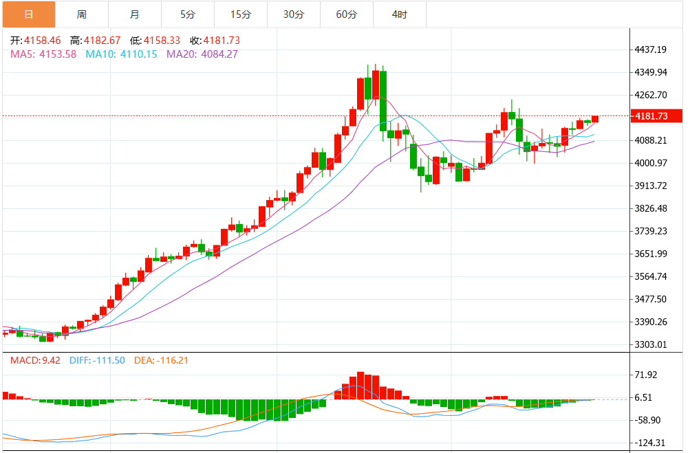 金价在亚洲时段一度冲高至两周最高位,现货黄金最高触及4193美元附近,随后虽小幅回落,欧市盘初,金价窄幅震荡,但整体仍牢牢守住了前一日的绝大部分涨幅。目前现货黄金在4180美元附近高位震荡,距离4200美元整数心理大关仅一步之遥。市场多空双方正在此展开激烈争夺,一旦突破4200美元,黄金有望迎来新一轮爆炸式上涨