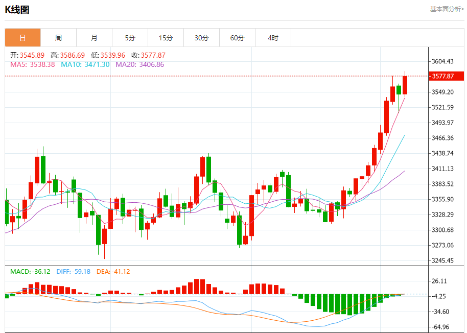 行情表现 截至发稿,国际黄金期货(纽约金)价格为3596.3美元/盎司,较前一交易日下跌39.2美元,跌幅1.08%,最高达到3621.6美元/盎司,最低为3573.7美元/盎司;国际黄金现货(伦敦金现)价格为3542.88美元/盎司,下跌17.41美元,跌幅0.49%,最高3563.14美元/盎司,最低3510.92美元/盎司。 关键点位分析