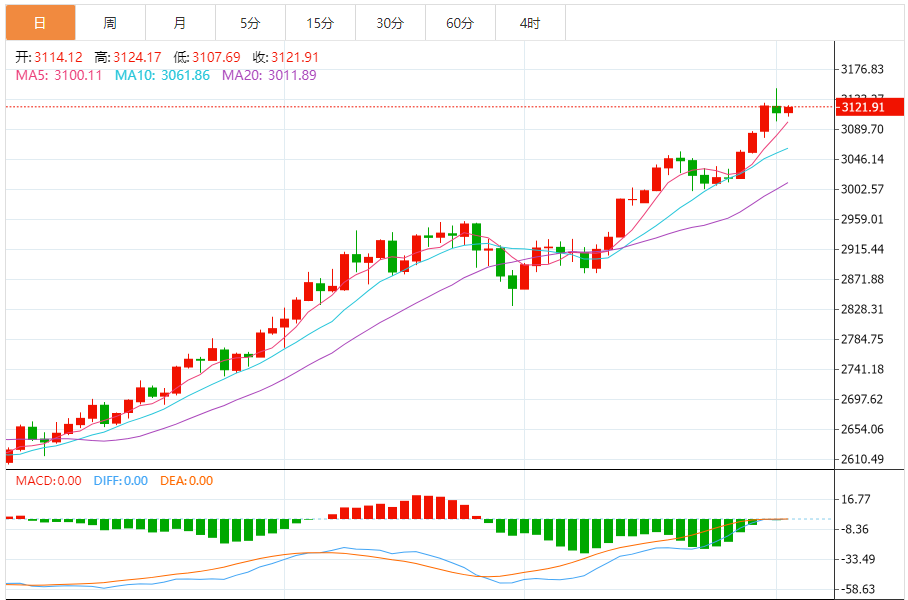 周三盘中,现货黄金报3120.96,涨幅0.23%。 今日分析:在3110.00之上,看涨,目标价位为3135.00,然后为3149.00。 技术点评:RI技术指标运行趋势复杂,倾向于上升。 支撑位:3110.003100.003090.00 阻力位:3160.003149.003135.00 (亚汇网编辑:冰凡)