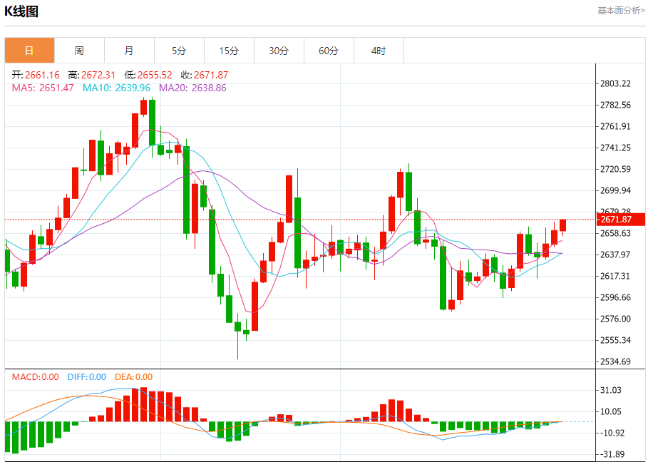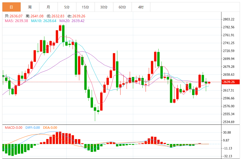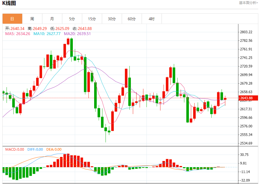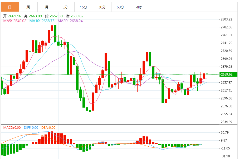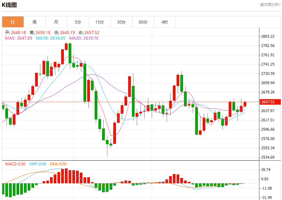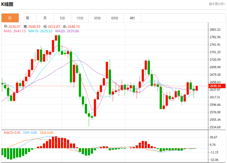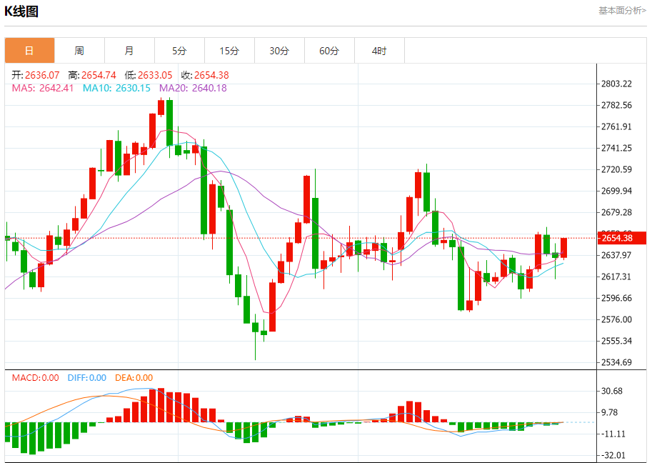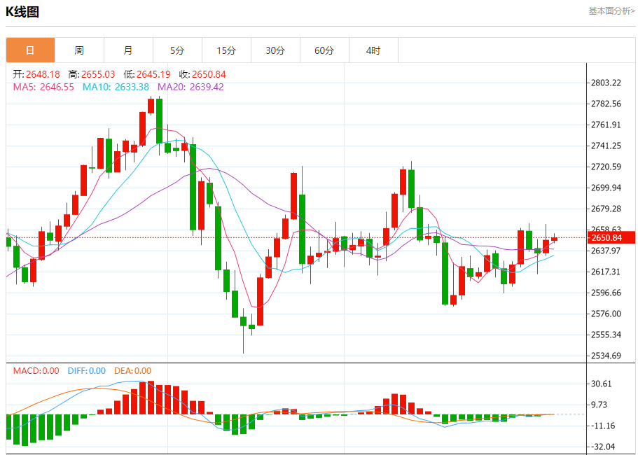 周二,昨夜动作比较大,盘中一度测试此前三周以来的高点2664美元受阻大幅回落,欧盘慢涨抗跌明显,所以晚间先是跟随短线多头在2650顺势跟多,测试2665压制位置后在2662反手布局空,踏准运行节奏多空换手。 今日黄金价格技术分析: 黄金昨日开盘从2632-33一线震荡上行至2641附近后回撤2636-37一线并逐步在该位置触