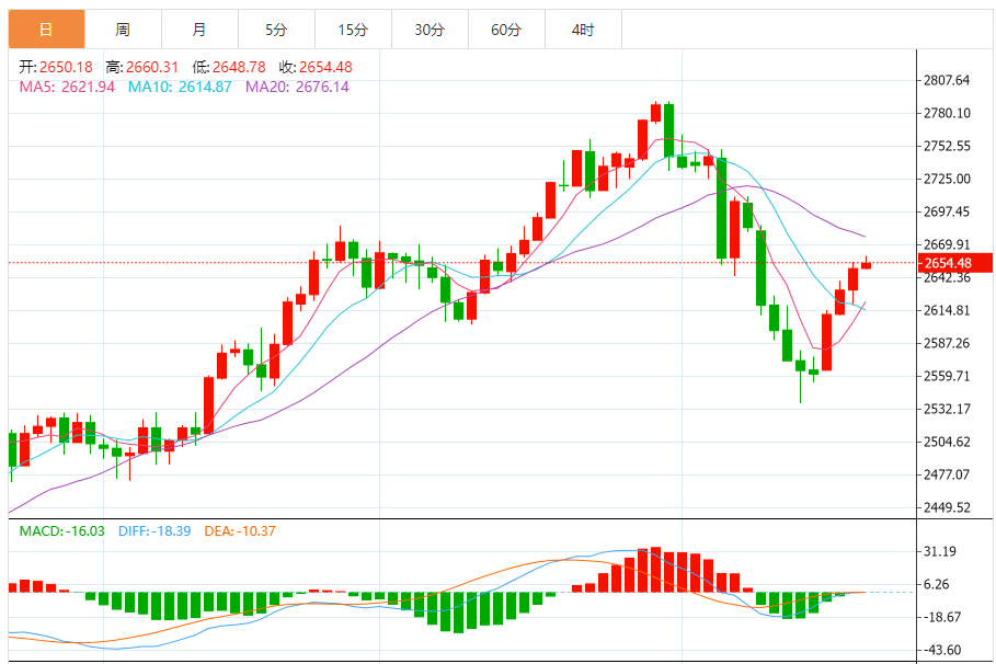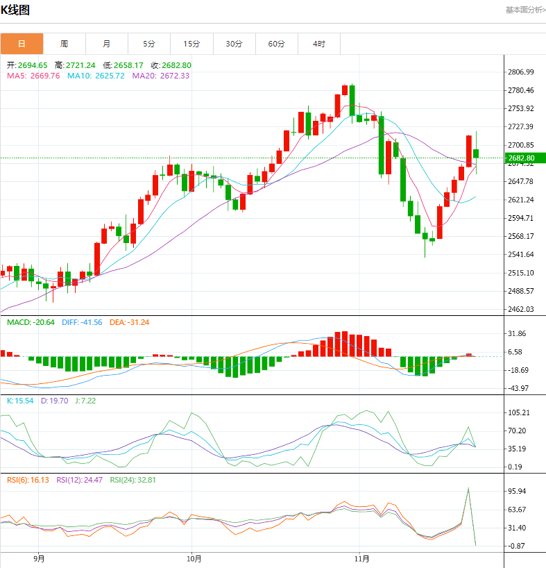 现货黄金价格在周一(11月25日)表现出显著波动,日内跌幅达1.74%。尽管跌破了此前三周高点,但价格依然守住了2650美元的关键支撑。这一走势受到多重基本面因素的共同影响,包括市场风险偏好的上升、美联储利率政策的不确定性,以及美债收益率的回调。 今日黄金价格技术分析: 从技术角度看,金价需跌破2650
