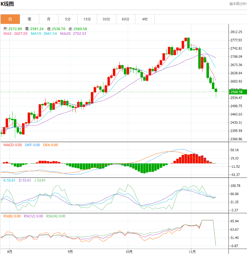 现货黄金下跌0.12%,报2561.72美元/盎司,本周累计下跌4.58%,创2021年6月以来最大单周跌幅,当年6月18日当周跌超6.038%至1764.16美元。基金经理的黄金多头头寸降至逾三个月最低,因为唐纳德·特朗普在大选中取得决定性胜利降低了对黄金的避险需求。美国政府周五公布的周度数据显示,截至11月12日,对冲基金和其他大投机
