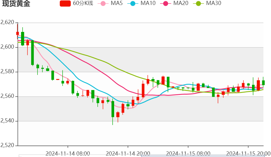 周五(11月15日)亚市早盘,现货黄金窄幅震荡,目前交投于2566.10美元/盎司。金价周四探底回升,因为受到美元强劲反弹的打压,早些时候一度失守100日均线,创近两个月新低至2536.68美元/盎司,但后来受到逢低买盘支撑,金价收盘跌幅收窄,收报2564.51美元/盎司。但需要提醒的是,美联储主席鲍威尔在最新的讲话中传递“无