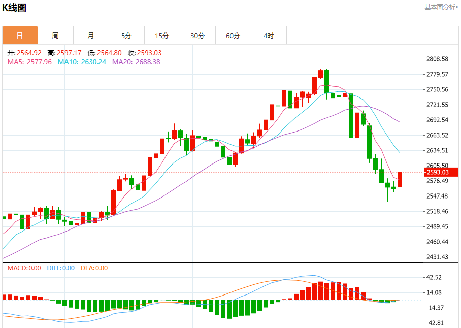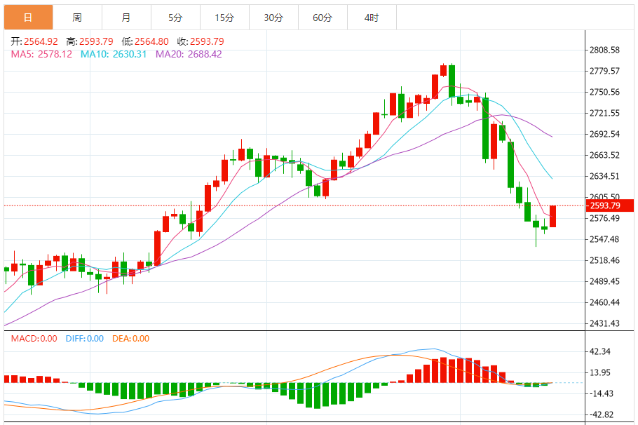 周一盘中,现货黄金报2594.26,涨幅1.28%。 今日分析:在2569.00之上,看涨,目标价位为2600.00,然后为2618.00。 技术点评:RI技术指标上,看涨。 支撑位:2569.002557.002545.00 阻力位:2627.002618.002600.00 (亚汇网编辑:冰凡)