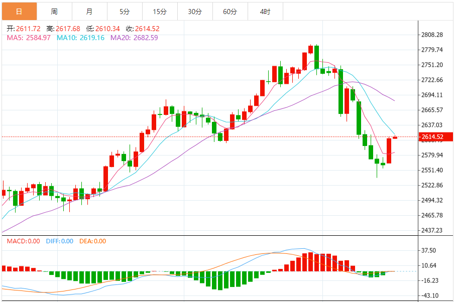 周二(11月19日),现货黄金目前位于2614.65美元/盎司附近,涨幅为0.12%。 黄金市场基本面分析 周一现货黄金高开加反弹上涨近40美元,后续连续上涨20美元,高位直接是冲破2610以上,周末俄乌紧张局势有所加剧,市场避险情绪有所增加,给金价提供反弹动能。金价上周五小幅走弱,收报2561.52美元,上周线黄