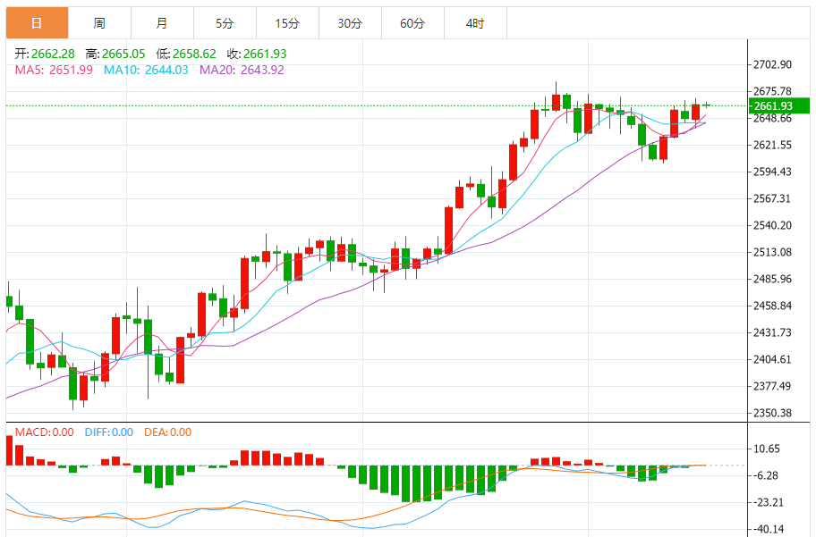 10月16日,周三亚盘,黄金交投于2662.23附近。 周二,黄金价格小幅走高,测试周线高点,离9月份创下的纪录高位2,685.45美元不远。金价受益于风险厌恶情绪和美元需求缓解,尽管金价远未转为看跌。 由于美国宏观经济学日历仍然清淡,投机兴趣从股票中寻找线索。华尔街周一创下历史新高,但由于石油价格下跌削弱了能源板