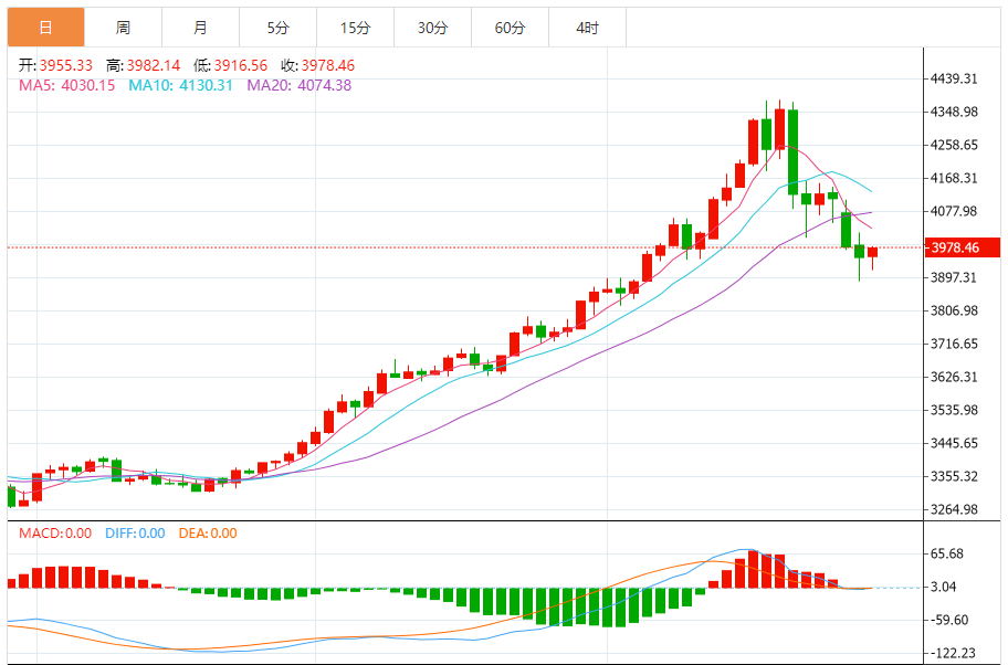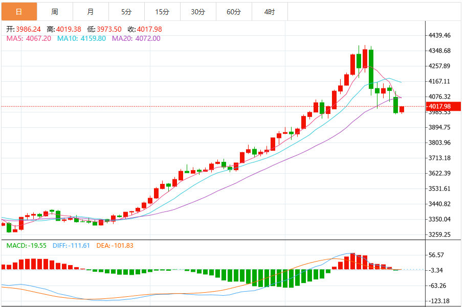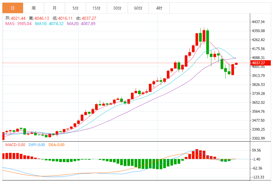 截至2025年10月29日19时27分,国际黄金期货(纽约金)价格为4041美元/盎司,较前一交易日上涨57.9美元,涨幅1.45%,最高达到4043.7美元/盎司,最低为3930美元/盎司。以下是对当日黄金走势关键点位的详细解析: 从日线级别来看 支撑位:黄金价格自上周在4381价位遇阻后进入调整阶段,本周二最低下探至3886
