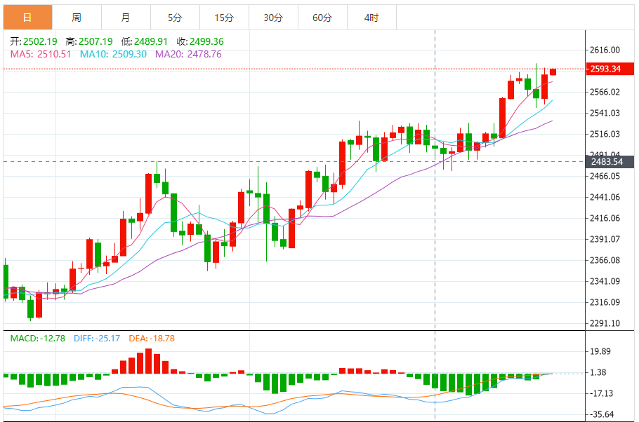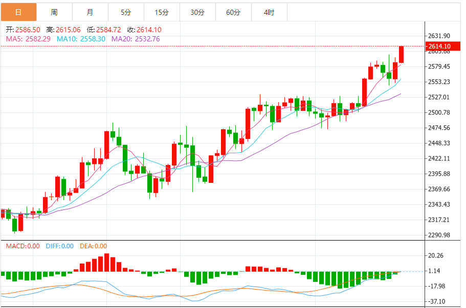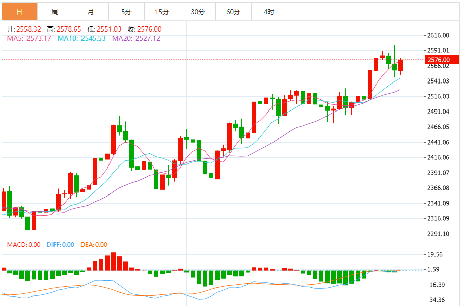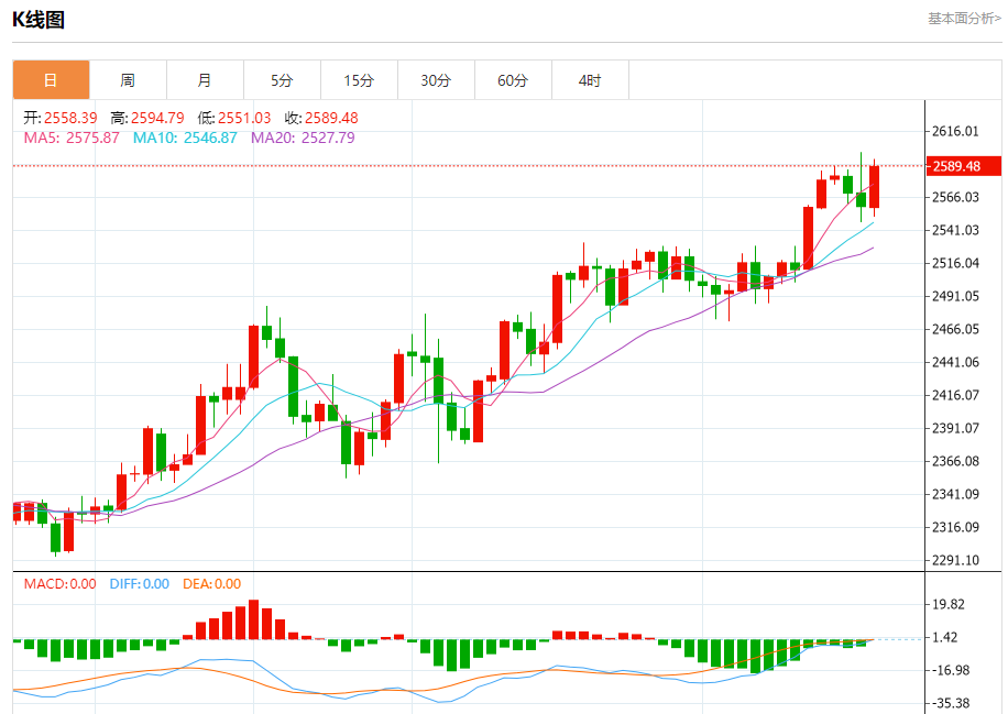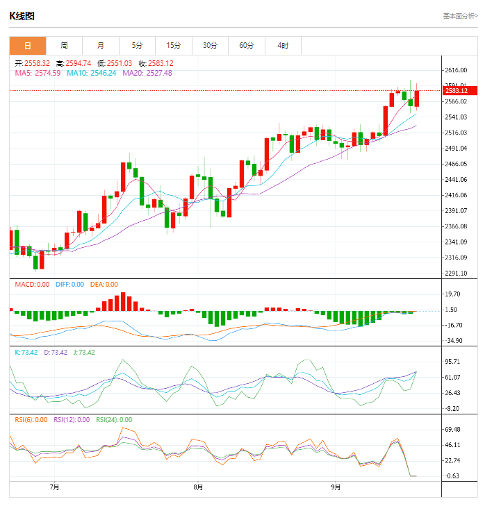 9月19日,周四欧市盘中,黄金小幅走高,周四回落至2580美元,此前在美联储(Fd)决定利率后跌至2540美元。 黄金周三创下2600美元的历史新高,然后在备受期待的美联储会议后迅速回落,在会议上,他们决定将联邦基金利率下调50个基点(0.50%)。这将美联储的基准利率从之前的5.25%-5.50%降至4.75%-5.25%的区间。 在美联