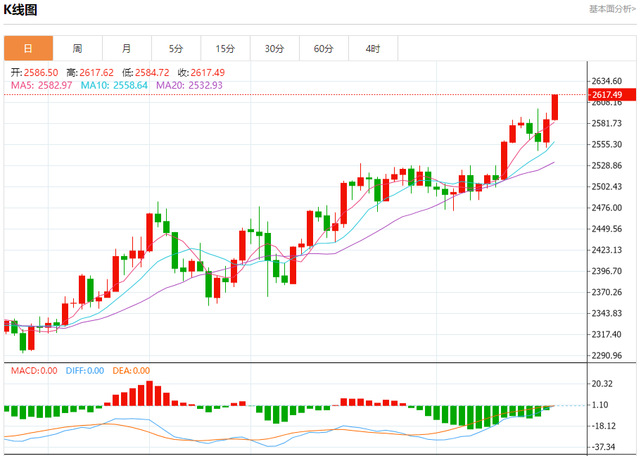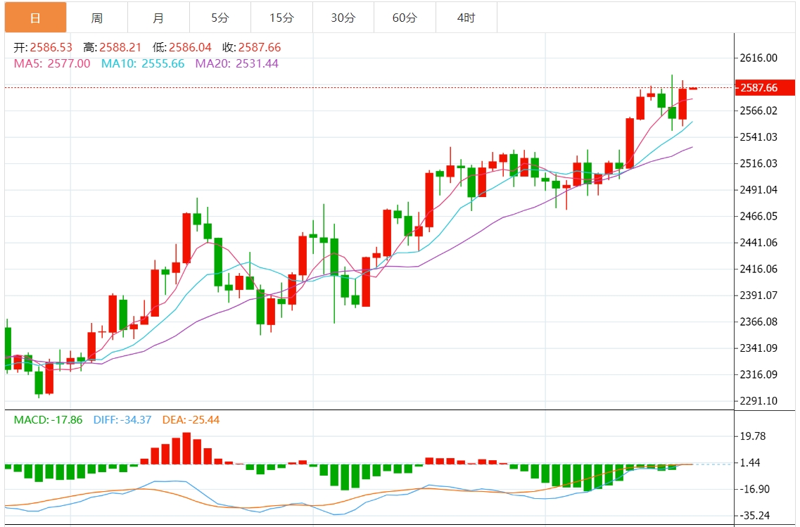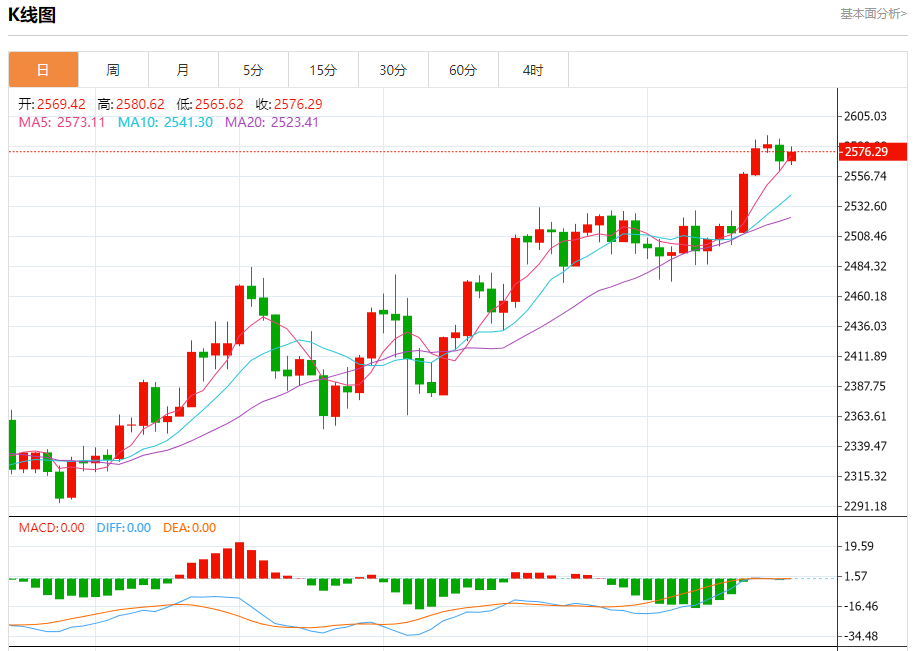 现货黄金刚刚突破2580.00美元/盎司关口,最新报2580.01美元/盎司,日内涨0.41% 今日黄金价格技术分析: 过多的停留在高位对多头不利,价格处在高位而不去刷新高点,这就是耍流氓,强势行情一定是不断破高,而不是停滞不前,高位震荡只会过多的削弱上攻的动能,面临力竭而衰的风险尤其是当前市场并不稳定,多