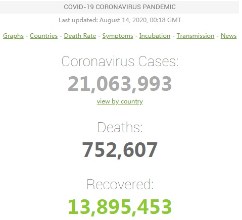 Worldometers世界实时统计数据显示,截至北京时间8月14日8时18分,全球新冠肺炎累计确诊病例突破2106万例,达到21,063,993例,累计死亡病例超过75.2万例,达到752,607例。