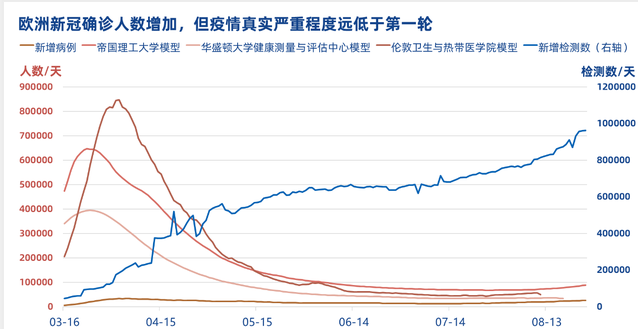 尽管看上去当前欧洲每日新增病例已经接近4月份最高峰,帝国理工大学、华盛顿大学健康测量和评估中心以及伦敦卫生与热带医学院等三个顶尖机构的模型均显示,截至8月下旬本轮疫情中欧洲的每日新增病毒携带者大约为第一轮疫情高峰期的10%。