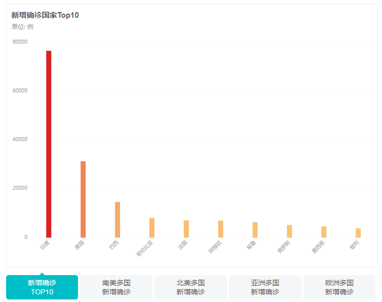 印度卫生部9月7日公布的最新数据显示,印度新冠肺炎确诊病例升至4204613例。在过去24小时内,印度新增确诊病例90802例,再达疫情暴发以来单日新增最高增幅,连续40天日增超5万例。新增死亡病例1016例,累计死亡71642例。根据worldometer最新数据,印度已经超过巴西,成为全球新冠肺炎确诊病例数量第二高的国家。