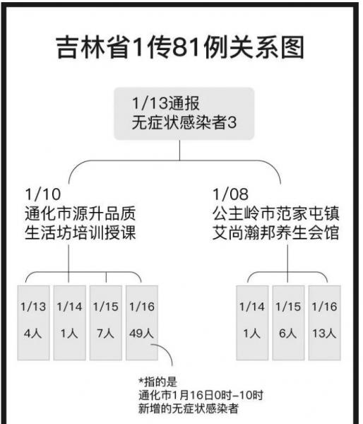 截至1月16日上午10时,据吉林官方通报,这两场培训课已经直接、间接造成81人感染新冠肺炎,81人均被诊断为无症状感染者。这81人中,32人的详情已公布,澎湃新闻梳理发现,其中22人为前来参加授课的学员,6人为培训场所的老板或员工,还有4人为参加过培训的人员的亲属。