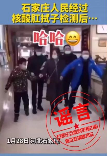 1月31日消息,近日,一则“石家庄市民经过肛拭子核酸检测后秒变企鹅,走路姿势变成了外八字”的视频在各大网络平台广泛传播。经石家庄互联网举报中心向市卫健部门和市新冠肺炎救治专家组成员市第五医院王海滨主任医师核实,网传消息为移花接木式谣言,石家庄自2021年发生疫情以来各社区采集标本均为口咽或鼻咽拭子,各社区从未采集过肛拭子,肛拭子标本只对住院并发腹泻的新冠肺炎患者进行采集,且肛拭子采集后无明显不适。