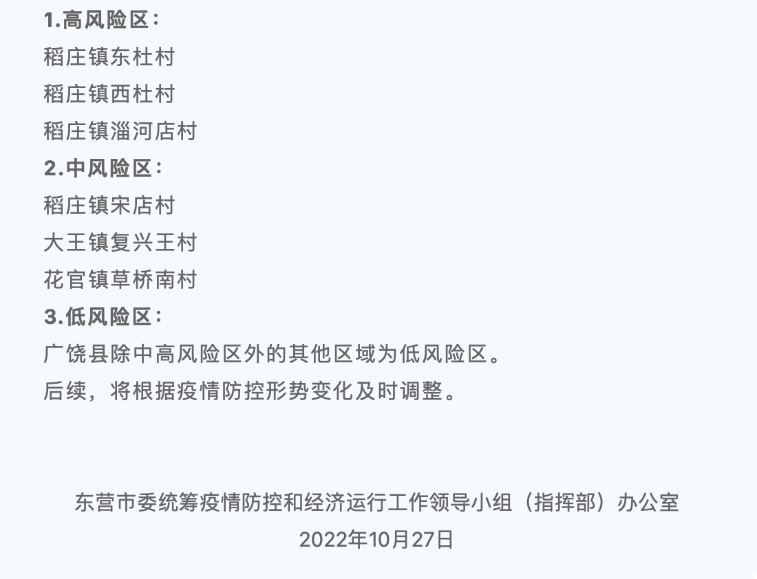 【山东东营广饶县新增多个高中风险区】2022年10月27日,山东省东营市委统筹疫情防控和经济运行工作领导小组(指挥部)办公室发布公告称,为快速有效阻断疫情传播扩散,切实保障辖区群众生命安全和身体健康,根据国务院联防联控机制有关规定,经专家组综合研判,即日起将下列场所划定为中高风险区。