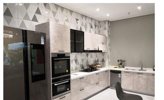 现在市面上的油烟机分顶吸式油烟机和欧式油烟机,这款开放式厨房选用欧式油烟机,不仅安装起来比较方便,同时价格也比较适中,深受大众的认可。