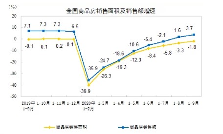 国家统计局数据显示,1~9月份,全国商品房销售面积117073万平方米,同比下降1.8%,降幅比1~8月份收窄1.5个百分点;商品房销售额115647亿元,增长3.7%,增速提高2.1个百分点;房地产开发企业房屋施工面积859820万平方米,同比增长3.1%,增速比1~8月份回落0.2个百分点。