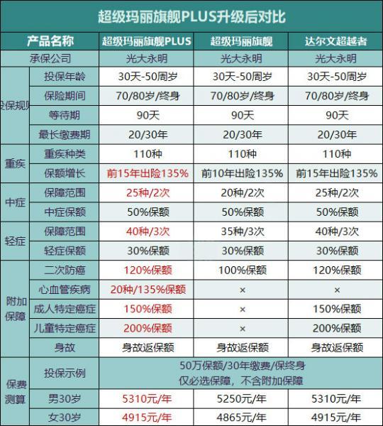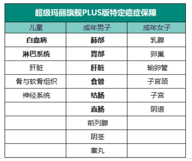 升级后的超级玛丽旗舰PLUS版 ,重疾、中症、轻症、二次防癌、身故、儿童及成年男女特定癌症,在保障内容和价格上,与达尔文超越者完全一致。