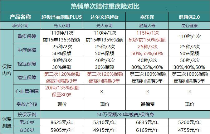 目前,重疾险的标准配置已经是:重疾+中症+轻症+二次防癌,我们对比市场上竞争力最强的4款产品: