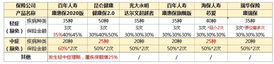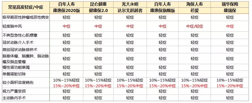 轻症、中症保障方面,几款产品都自带轻症中症豁免,而且对业内比较关注的11种常见高发疾病,皆实现全面覆盖(见下图)。