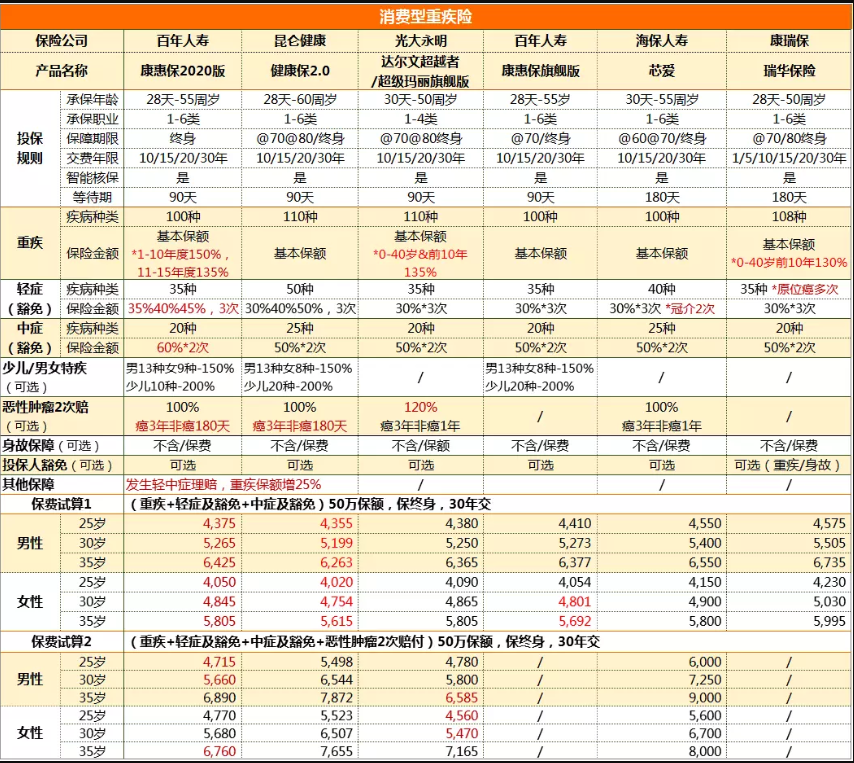 百年康惠保2020版产品性价比如何呢?在目前消费型重疾险市场上,小编梳理了目前市场上在售的热销消费型重疾险,以及停售前的达尔文超越者,如下表: