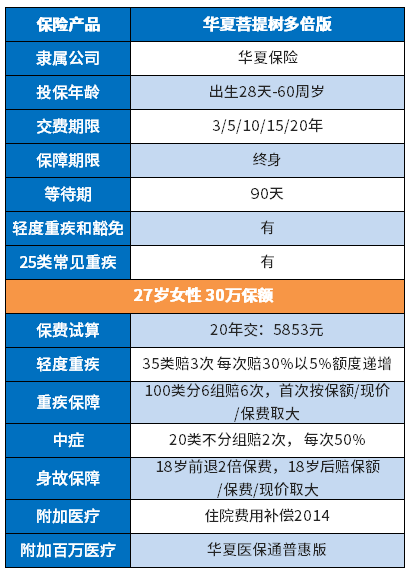 华夏保险近年来发展速度飞快,在保险市场上所占份额逐年增加,旗下的多款重疾产品也非常的受欢迎。最近有小伙伴问到华夏菩提树多倍版适合给1岁的孩子买吗? 我们先来看下华夏菩提树多倍版的基本情况 这款产品的优势在于: 1、轻疾、中症和重疾保障的全面 重疾分组多赔,癌症单独一组,二次赔付高,另外轻疾不分