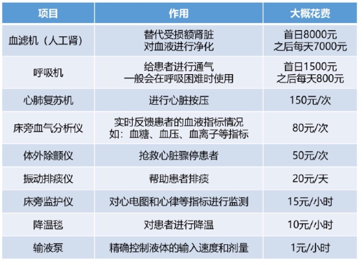 ÒÔÏÂÊdz£¼ûµÄICU·ÑÓÃ±í£¬×î¹óµÄѪÂË»ú£¬»¨·ÑÿÌìÐèÒª7-8ǧԪ£¬ÊÇÄÑÒÔÏëÏóµÄ¡£´ËÍ⣬ÔÚ¾ÈÖÎÎ£ÖØ²¡ÈËʱ£¬ÕâЩÉ豸ÓпÉÄÜ»áͬʱÓÃÉÏ£¬¿´ËÆÃ¿Ð¡Ê±Ã¿´ÎµÄµ¥¼Û¶¼²»¹ó£¬µ«Ò»ÌìÏÂÀ´»¨Ç®ÈçÁ÷Ë®¡£