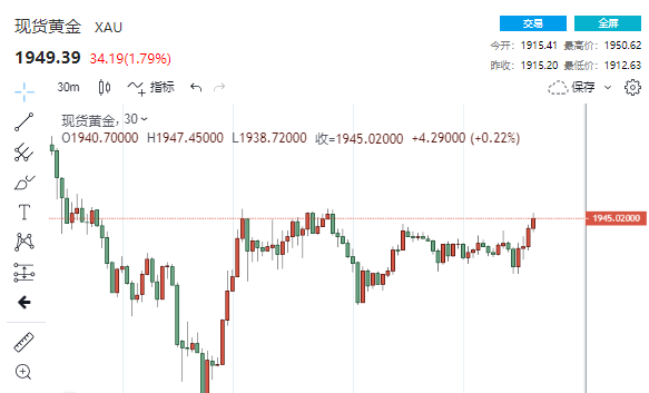美市盘中,现货黄金短线拉升30美元,刷新日高至1950.62美元/盎司,日内上涨约1.8%,前一交易日在震荡中跌至1900美元下方。上周五,金价飙升至纪录新高2072.50美元/盎司。