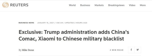 小米就被美方拉黑一事起诉美政府事件,源自本月中旬特朗普政府将9家中国企业列入所谓“与中国军方相关”的黑名单中,其中包括手机制造商小米及飞机制造商中国商飞。路透社评论称,特朗普政府不断扩大投资禁令“黑名单”,是要在任期最后几天巩固其对华强硬的“政治遗产”,截至目前已有包括中芯国际、中海油在内35家中企在名单中。